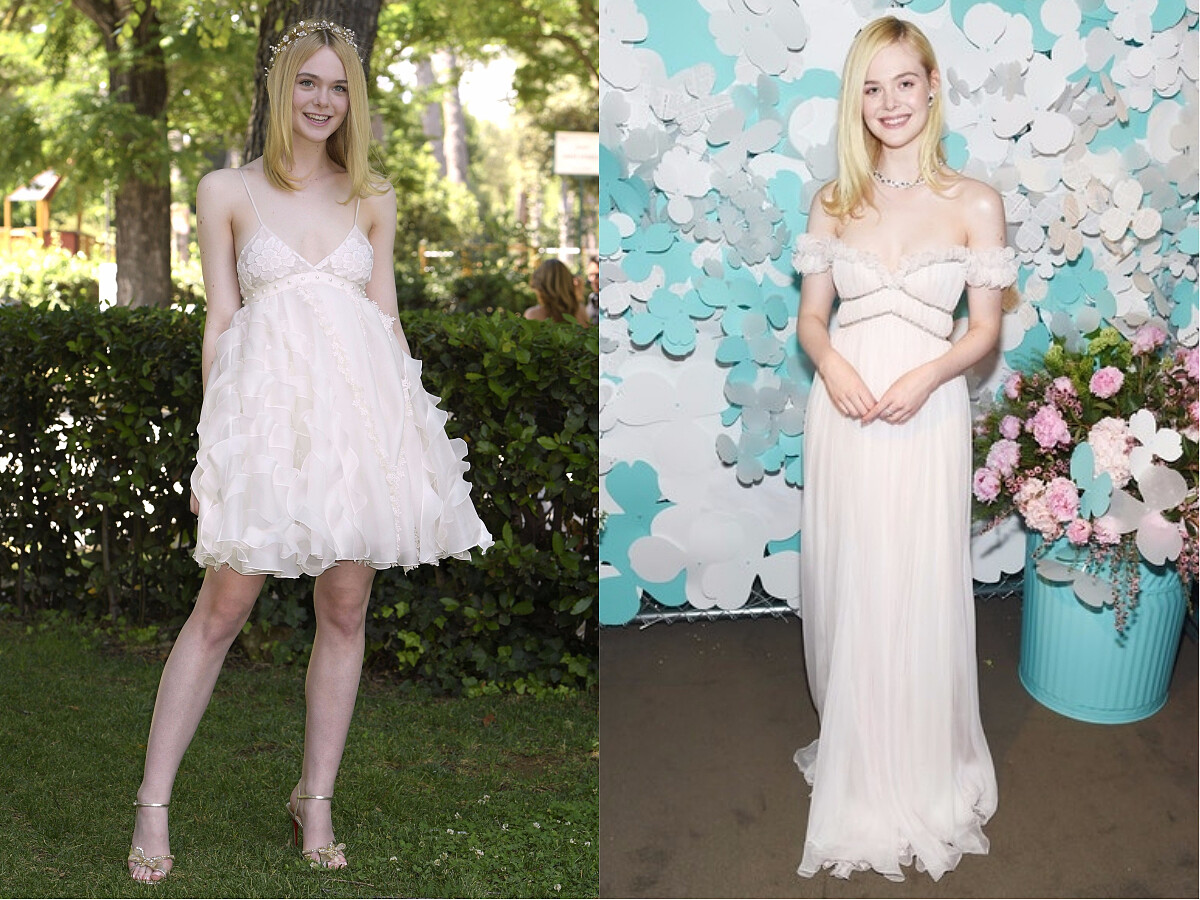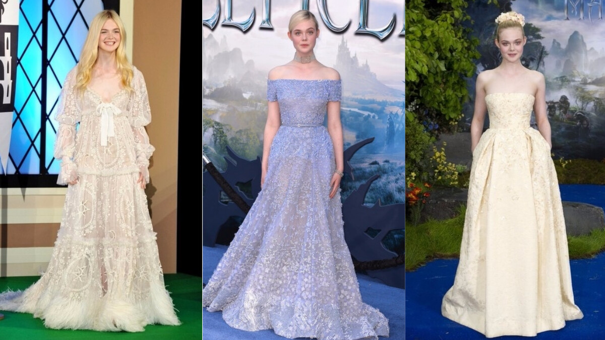 在出席電影相關活動時,Elle Fanning皆選擇穿上柔和色調的禮服:淺膚色刺繡雪紡洋裝,裙襬飾有同色的羽毛,搭上歐式宮廷袖與慵懶的V領,顯得迷人浪漫; 熏衣草色的一字領禮服,以滿綴的精緻雕花和頸上的珠寶頸鍊,共展恬靜的奢華美; 無任何閃耀的珠寶配飾,僅以花卉頭飾裝點並呼應禮服的色彩。