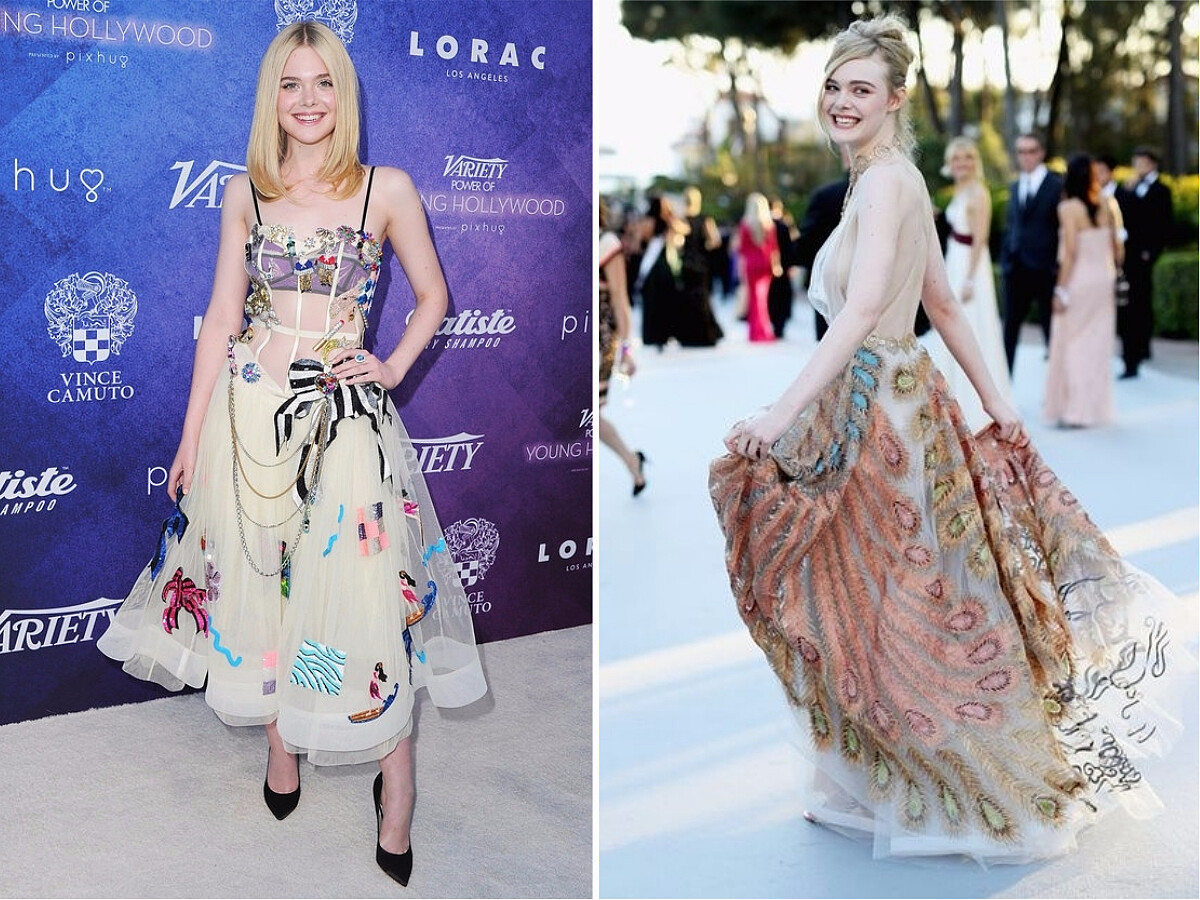 長大後的Elle Fanning同樣不失公主氣質,尤其再穿上飾滿俏皮塗鴉的紗裙洋裝後,散發童話般的魅力氣息,又或展翼著嬌艷羽毛的孔雀設計元素,在他身上也浪漫依舊,宛如精靈降臨。