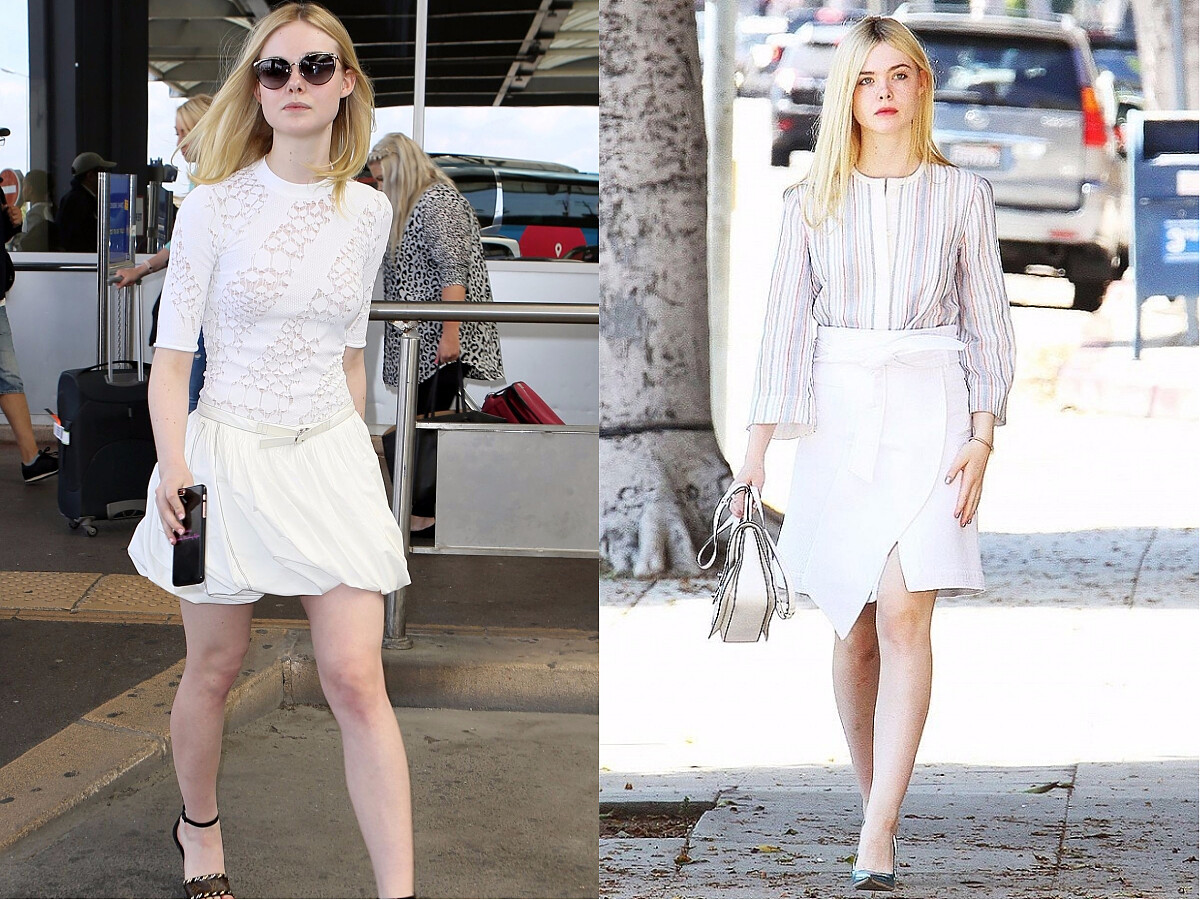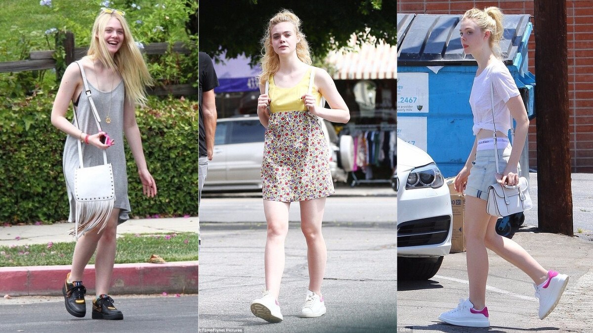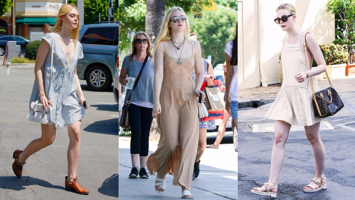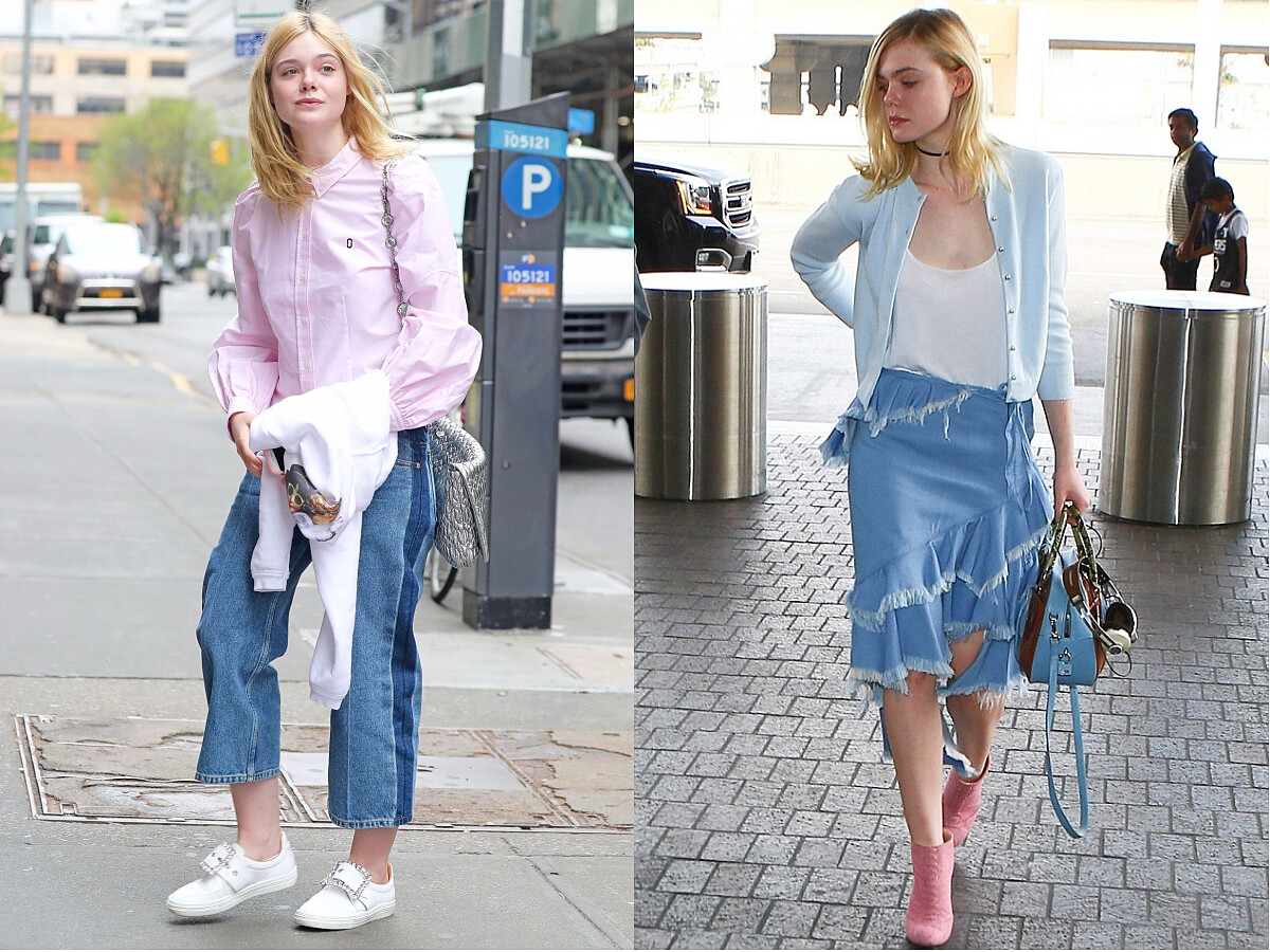 面對休閒裝扮Elle Fanning也有他自己專屬的一套!色彩上依然保留在輕柔的淡淺色,塑造清爽的夏日氛圍,然而,鞋子則特別穿上繪有鮮艷色點綴的款式,以小細節帶出朝氣。