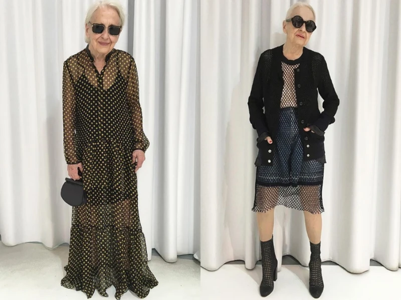 誰說上了年紀就不能穿透膚材質的服裝?Ernestine Stollberg就以一身透膚圓點洋裝穿出優雅格調,又或在格網衫外罩上一件針織外套,展現恰好的性感指度。