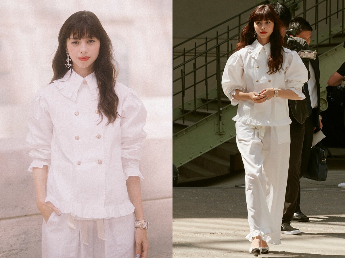 而現今的他在過了兩年後,顯得更加穩重又迷人; 在這次的18秋冬高級訂製秀上,Ayami Nakajo身著一身純白色裝束,大襯領、衣袖、衣擺、褲擺,皆鑲有甜美的荷葉滾邊,而雖然整體輪廓顯得寬鬆,但宮廷繡剪裁巧妙避開了視覺上的臃腫感,反而帶出典雅又氣質的風範。