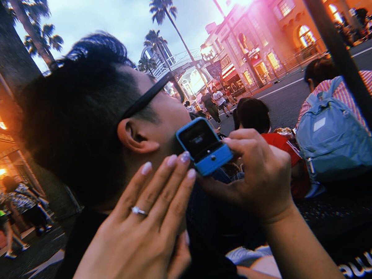 求婚那天是在日本環球影城,小費把灰灰拉到兒童遊戲區,「那邊都是小孩子,我比較不會緊張。鑽戒一直放在口袋,鼓鼓的,一直藏來藏去。」他假借要合照,然後請工作人員按錄影,向灰灰單膝下跪。「本來想好的求婚台詞當下全忘記了。就直接跟她說:妳要嫁給我嗎?」灰灰笑說,「他當下有點手忙腳亂,戒指又卡住掏不太出來,那場面好好笑,我邊笑邊打著他。」但這一刻是她期待已久的驚喜,馬上 Say Yes!成為小費的未婚妻。