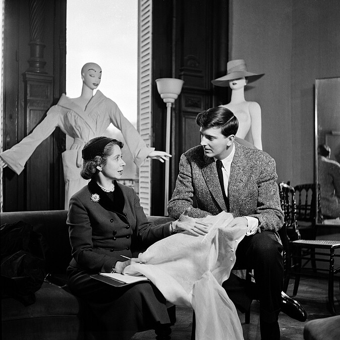 (這張照片攝於五〇年代,品牌創辦人 Hubert de Givenchy 為繆思 Audrey Hepburn 調整連身裙,兩人之間的合作關係與友誼長達40年時光。)