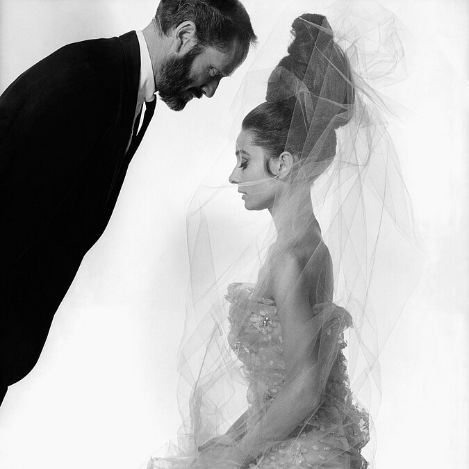 (Audrey Hepburn 穿著由刺繡薄紗製成的 Givenchy 禮服與頭紗,與第一任丈夫 Mel Ferrer 甜蜜合影。)