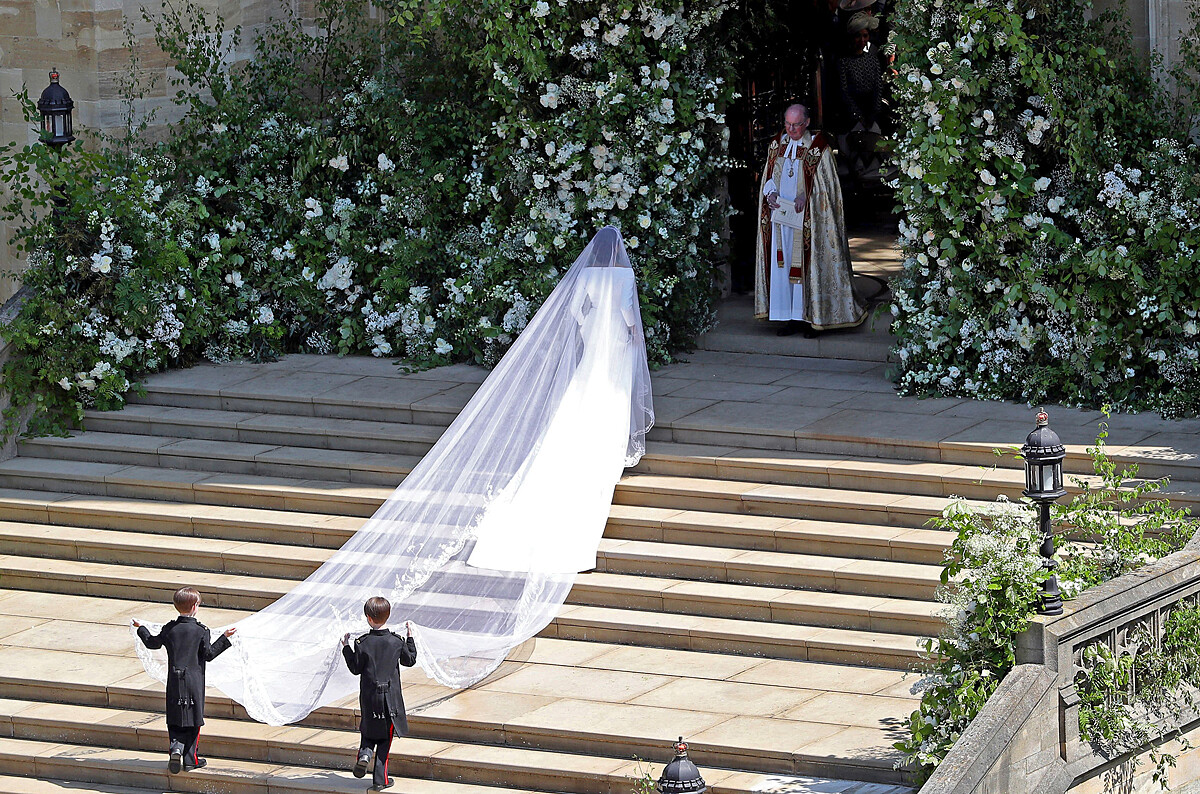 (Meghan Markle 的禮服是用雙層絲綢襯裙製成,但真正吸睛的主角,卻是那繡上英國聯邦花卉圖案、長達五公尺的頭紗。對此哈利王子深感讚嘆,甚至在招待會上對設計師 Clare Waight Keller 表示,「天哪,太謝謝妳了。她看起來真是美呆了。」)