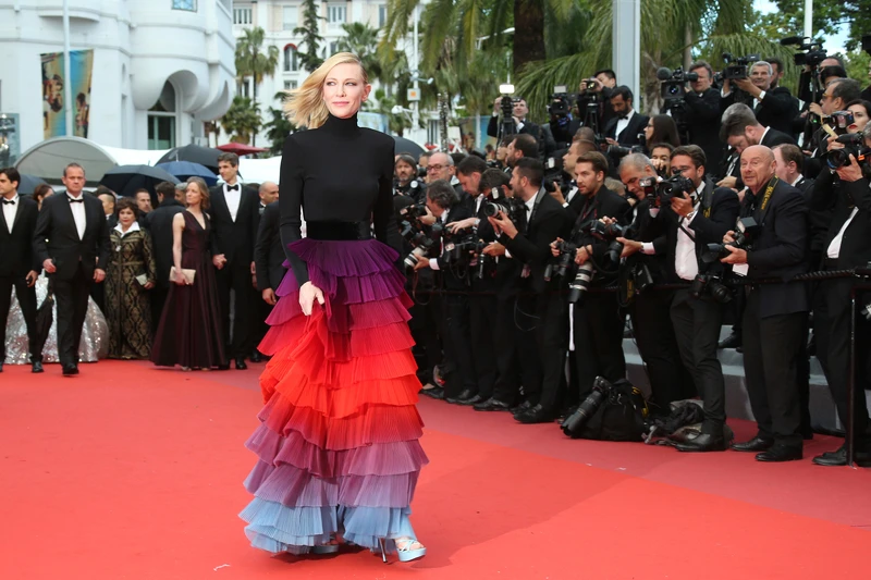 (今年坎城影展,奧斯卡影后 Cate Blanchett 穿上由現任藝術總監 Clare Waight Keller 設計的禮服。上身是優雅簡練的黑色,而裙身由漸層繽紛的色彩組成,展現典雅大器的影后魅力。)
