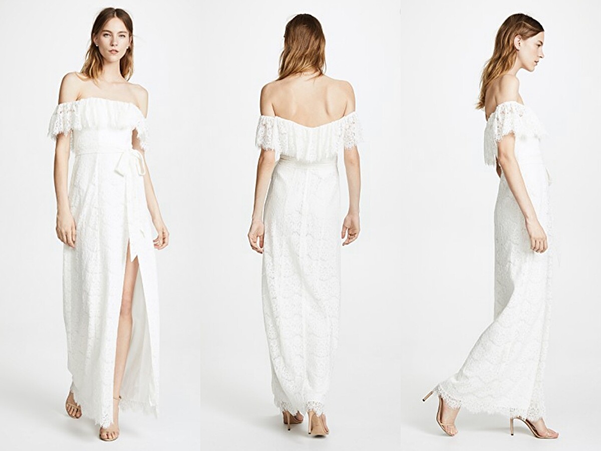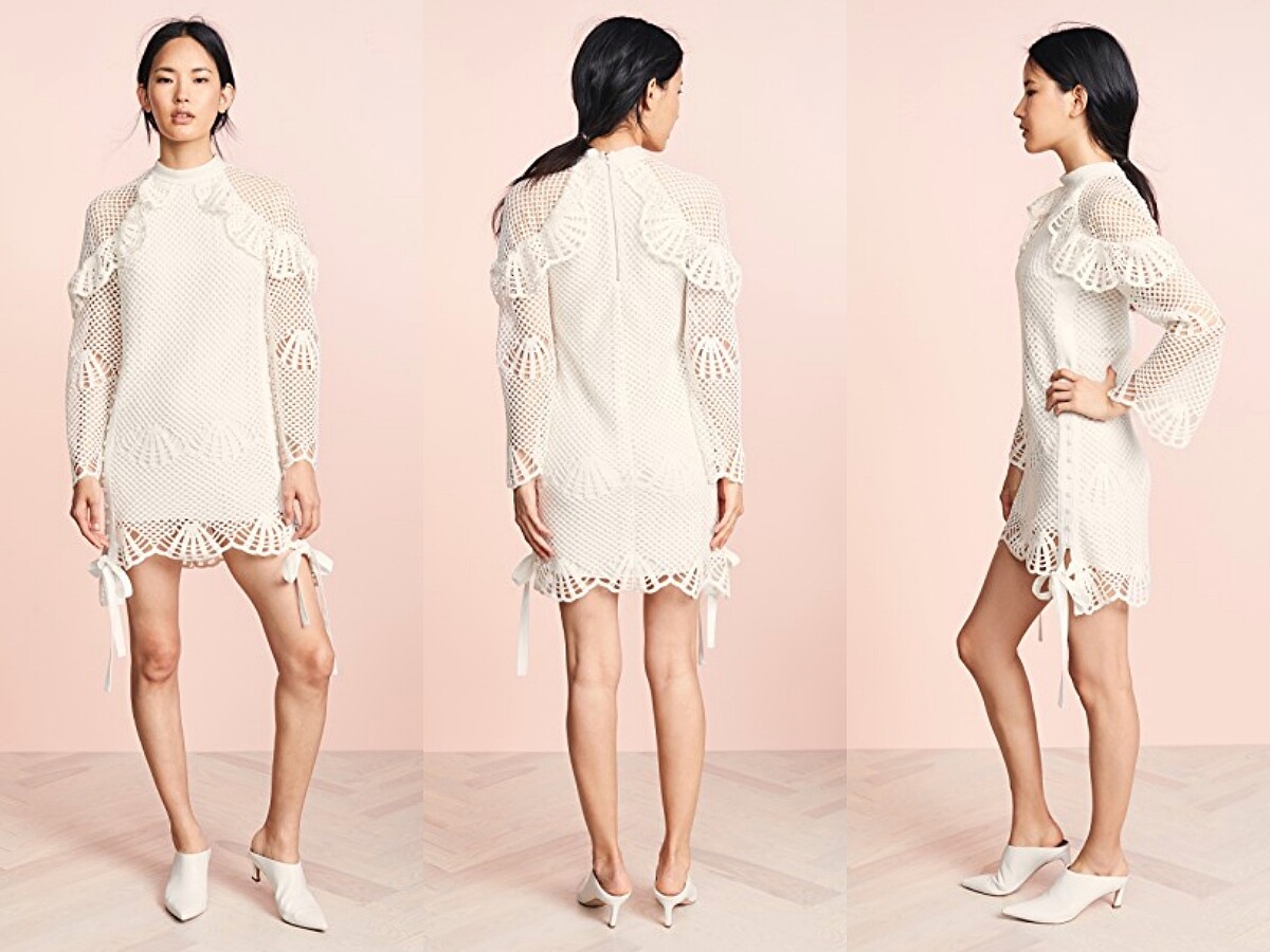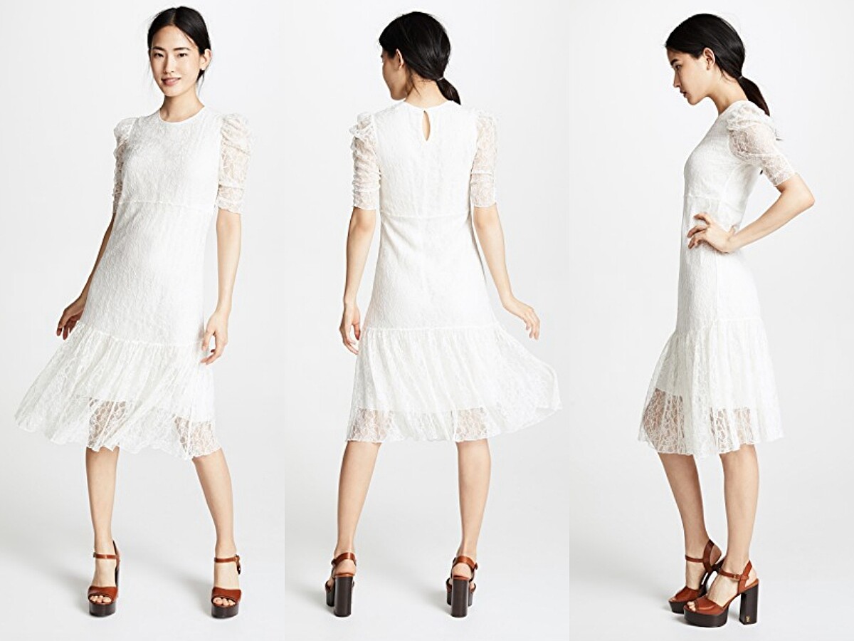 跳脫傳統婚紗的受限,這款緹花蕾絲拼接棉質的洋裝也照樣美得冒泡!設計擷取自古歐式宮廷服裝,除了有摺皺寬袖與澎鬆的下擺,當然也少不了精緻的蕾絲,後背的水滴型鏤空則完美突顯了身形的線條。造型上和休閒球鞋搭配既率性又時髦。