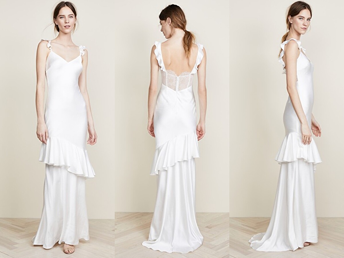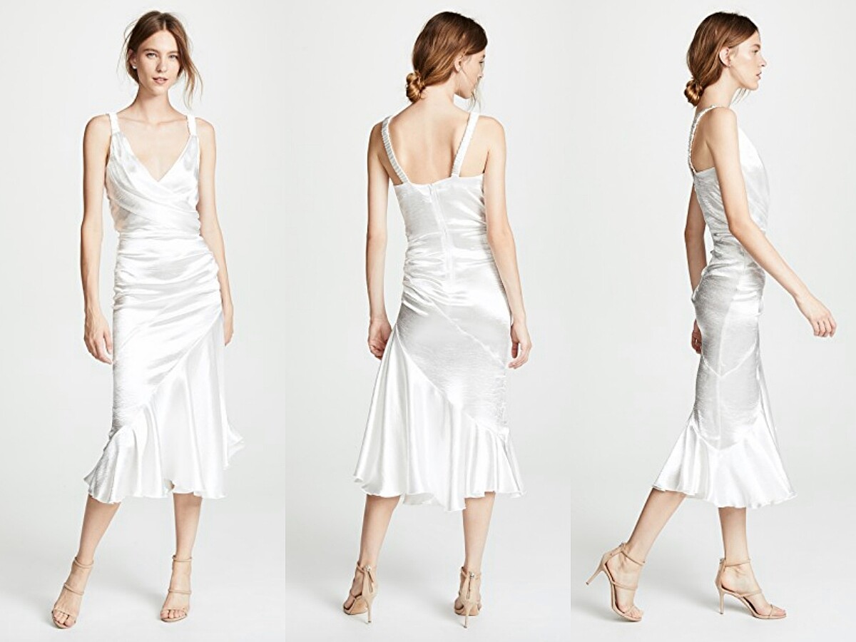 對蕾絲無感也沒關係,緞面的材質不僅顯得高雅,散發出的光澤比起亮片、珠飾等元素更顯質感。然而此款的雙層設計+波浪肩帶使禮服的浪漫得到昇華,此外,轉過身後腰處拼接上的透膚蕾絲+精細扣子,宛如馬甲般性感迷人。