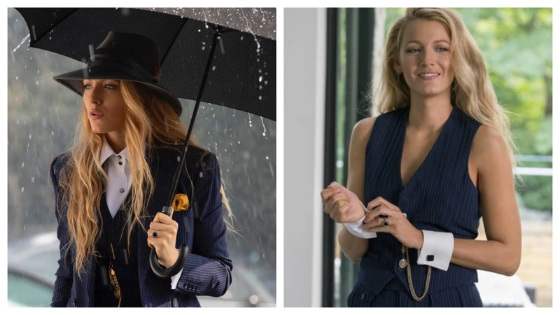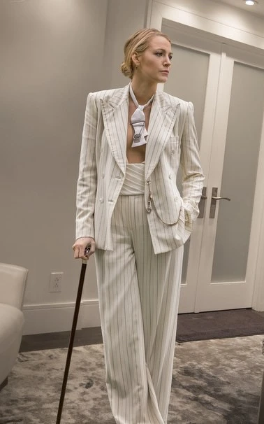 片中Blake Lively飾演的Emily是一位時裝設計師的公關總監,在片中都以俐落的西裝出現,第一個亮相鏡頭時便是在滂沱大雨中踩著一雙Christian Louboutin的天藍色絲絨高跟鞋現身,絲毫不在乎毀了她的名牌鞋。