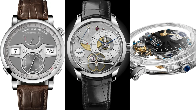 以腕錶作品為自己的觀點發聲,不炒作名人話題,也不跟風流行,有硬實力也專心致力製錶,回歸本質的智慧,為這場錶展添加看頭。首次加入 SIHH 參展,Bovet Fleurier 播威的行事作風正是如此,其中最有話題的新錶非 Récital 26 Brainstorm® Chapter One 莫屬,特殊的「寫字斜面形」藍寶石水晶透明錶殼一秒吸睛,前所未見的斜形架構與搭載的多重專利複雜功能(12點鐘位置的分鐘錶盤設有立體月相顯示,4點鐘位置的「新月形」顯示動力儲存, 8點鐘位置是大日曆,6點鐘位置為雙面飛行陀飛輪),360度完整呈現眼前,大大增強賞錶趣味。A.Lange & Söhne 朗格的招牌系列Lange 1今年適逢推出第25年,周年紀念款在時標、指針、日期數字與錶背的夾板都以迷人深藍呈現,突顯面盤佈局的不對稱美學。另一新作 Zeitwerk Date 則是溯源10年前發表的跳字顯示功能,新錶最大的特點在於錶盤外圈增加了可快調、由紅色色塊顯示的日期環;而橫跨錶盤的德國銀製「時間橋」,讓橫向排列的小時窗與雙位數分鐘窗更加一目了然,並上下劃分為動力儲存指示與小秒盤,是一款風格強烈又兼具製錶內涵的話題作品。以「Art of Invention 發明的藝術」為最高指導原則,Greubel Forsey 高珀富斯發表兩款新作,首先是 Art Piece Edition Historique 藝術品系列復刻紀念版腕錶,多層次面盤具備30度雙體陀飛輪(左下)、小秒盤(左上)、時分指示(右上)與動力儲存指示(右下),同樣引人矚目的是時分指示環上,微型雕刻的1045個字彙,雖然讓判讀時間需要花點功夫,卻是刻意要時分顯示退位,以彰顯品牌製錶哲學的巧思。看了GF拿手的高複雜功能與大型錶殼尺寸,這款 Balancier Contemporain 擺輪腕錶則相對簡約輕巧,既然發揮的「空間」變小了,更要講求高效與精確,製錶師直言製作這款腕錶最大挑戰,是將大尺寸的機戒裝置縮小,同時得要兼顧美感比例及錶盤獨特立體結構的和諧;最終的成品,由煥然一新的顯示方式、多層機構、不同金屬材質、色調和打磨效果..等等元素彼此相映成趣,展現GF掌握機械與美感的功力。