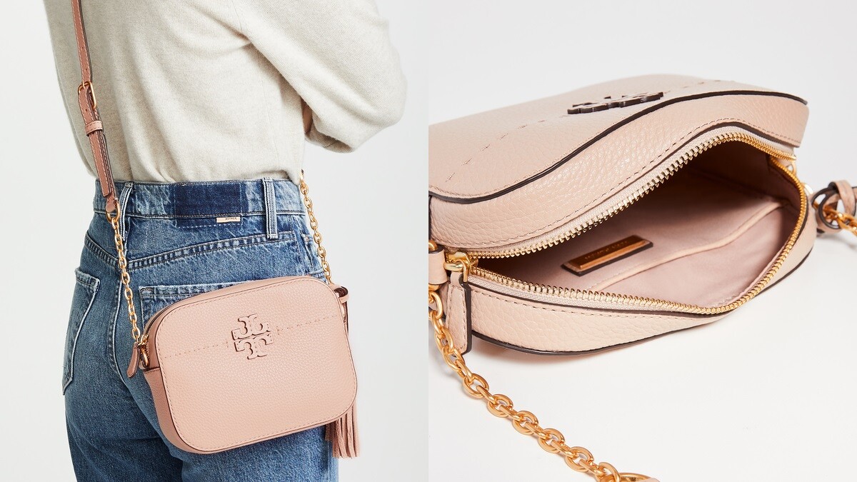搶搭上奶茶色調的還有設計師品牌Tory Burch,帶點粉嫩的奶茶色相機包絕對是女孩們不能錯過的單品。體積小巧能裝的東西卻不少,外觀還有標誌性的雙T Logo及流蘇,很適合外出遊玩攜帶。