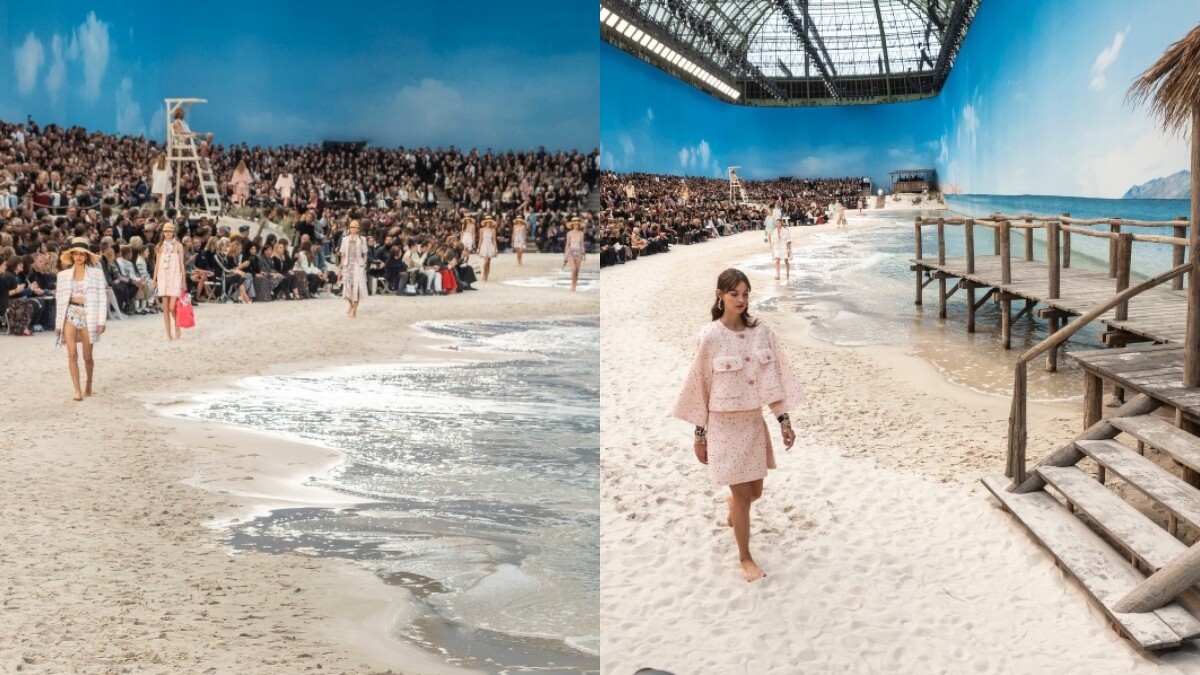 到海邊辦秀不稀奇,卡爾可是將整座巴黎大皇宮變成沙灘,有貨真價實的沙子及海水,更讓模特兒赤足登上伸展台,而與會的賓客也必須踩上沙灘看秀。
