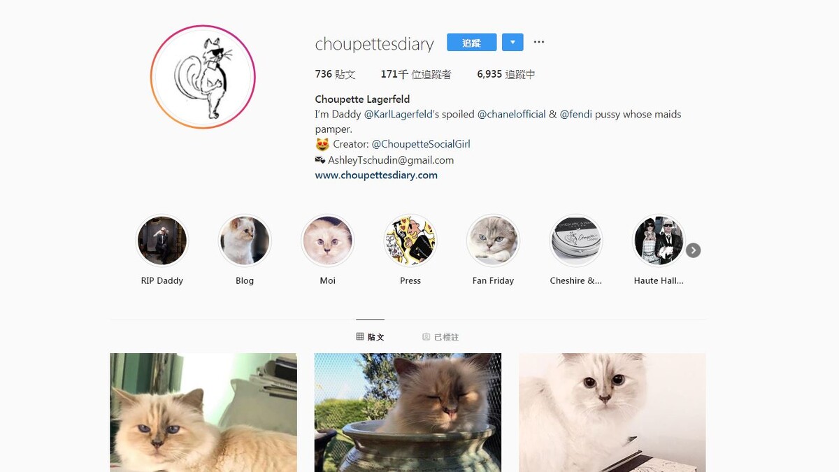 為了愛貓Choupette,卡爾更命人建立她的社群Instagram,如今已超過17萬人追蹤,受歡迎的程度絕對超乎你想像,而她的大頭照也是一大亮點,處處都可以看見卡爾愛她痴狂的身影。