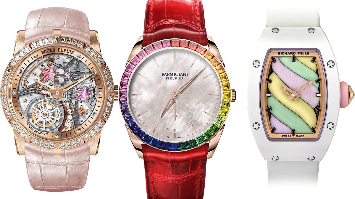 飽滿錶徑、鮮明用色與功能細節,氣場十足的大錶,不只在錶展期間引起話題討論,更是當代女人們展現自我的時髦宣言。Roger Dubuis 就是這樣的個性品牌,新款《Excalibur Shooting Star》流星腕錶的尺寸不輸男錶,在機芯製作上則更花心思,花費兩年才研發完成的鏤空飛行陀飛輪裝飾了鑽石與半透明彩漆,讓品牌經典的「Astral Skeleton 星辰鏤空」標誌更搶眼,其它細節如錶圈鑲鑽、錶背鐫刻星星圖案、可快拆更換的錶帶…,美麗又囂張的女錶新品種,完全讓人愛不釋手。Parmigiani 帕瑪強尼《Tonda 1950 Rainbow》將品牌經典款尺寸刻意加大,不只為了要讓介於正圓與橢圓之間的錶殼輪廓更有氣場,也取得更多的寶石發揮空間—21顆粉色、藍色、黄色和橙色藍寶石以及3顆紅寶石、6顆沙弗萊石和6顆紫水晶,總重3.73克拉,精心切割為視覺面積較大的長方型,並排列出漸變彩虹色調,再搭配上珍珠母貝面盤與豔色錶帶,吸睛力十足。10款Richard Mille《Bonbon》系列腕錶以既有的RM 07-03、RM 16-01和RM 37-01為基礎,忠實沿襲錶款的前衛科技感之外,以多項獨家專利的全新工藝,製作出水果與甜點主題的可愛元素,是大膽又有趣的衝突結合。《RM 07-03 Marshmallow》的棉花糖主題面盤由錶匠手工上釉,搭配紫色與白色陶瓷錶殼;《RM 07-03 Litchi》的錶殼由黑色Carbon TPT®和彩色Quartz TPT®交替重疊,呈現波紋漸變效果,小型的糖果與水果裝飾同樣以最講究的純手工方式繪製,為了要有最逼真的糖粒效果,還加入琺瑯碎屑和沙漏砂礫;可愛意象融入個性輪廓,是甜而不膩的表現手法。