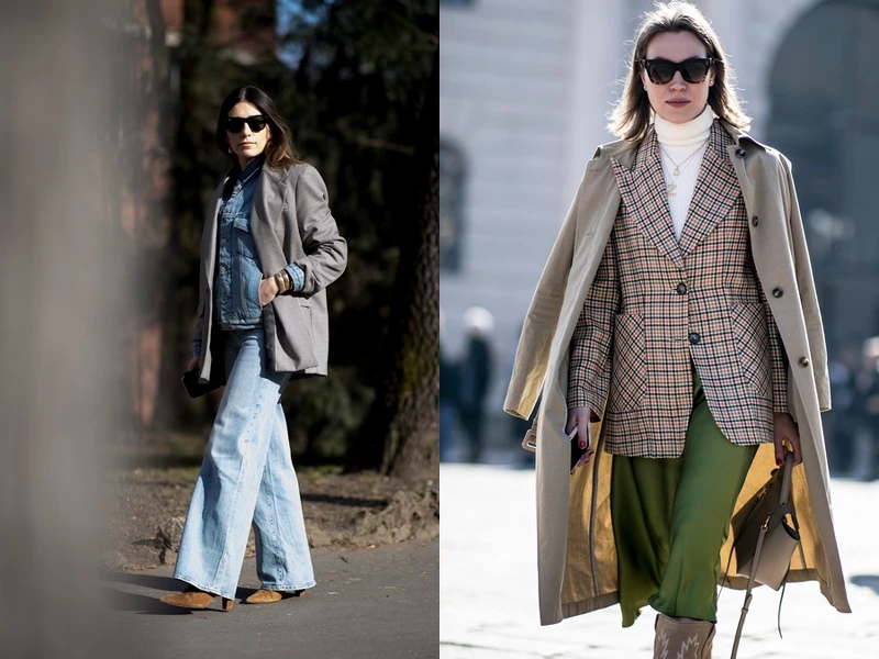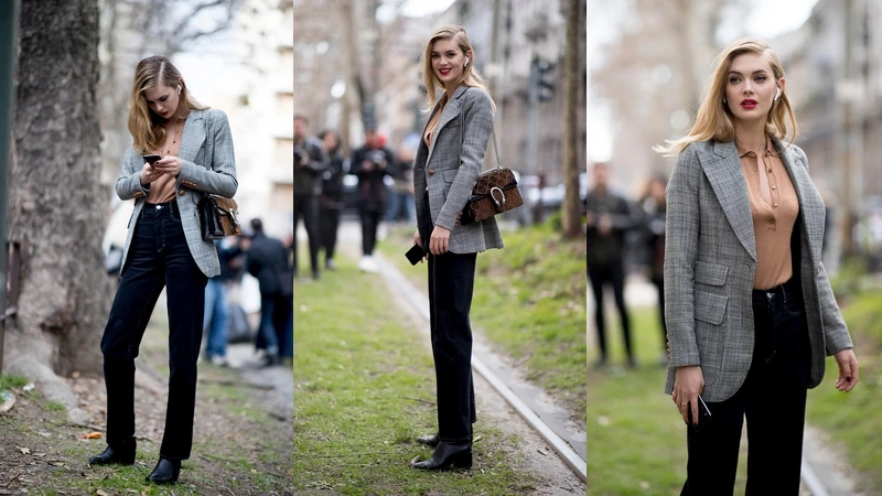 有別於規規矩矩的穿搭,像是成套牛仔裝束搭配上西裝外裝,同樣吸睛度十度。還有多層次的穿搭,白色高領毛衣、緞面半裙加上格紋西裝外套最後再披上風衣大衣,這款細格紋的西裝外套變成穿搭的重心。