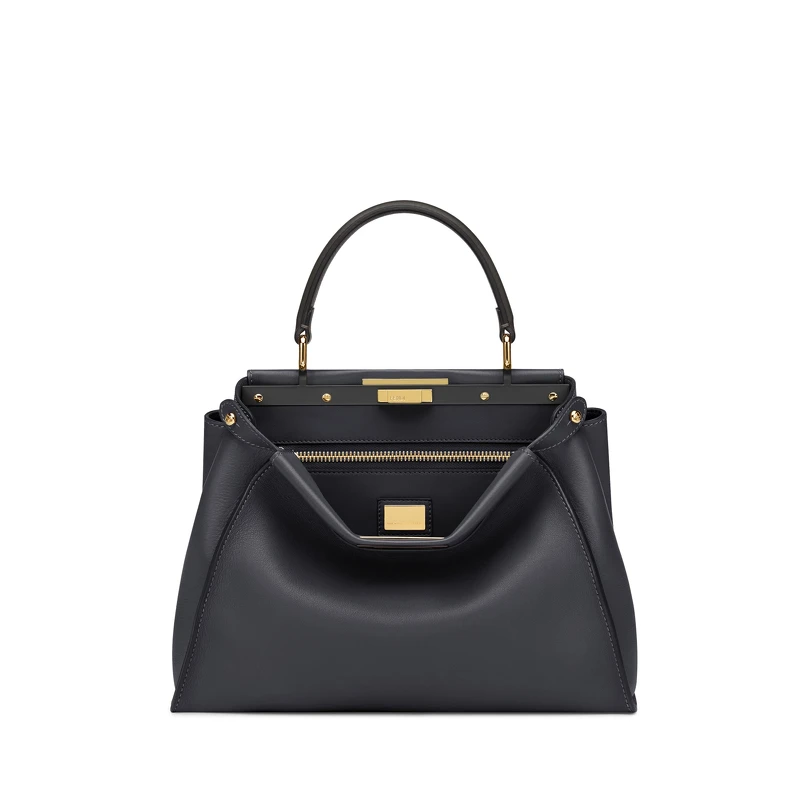 - 著名建築師 Zaha Hadid 運用原創幾何手法,設計出這款標準款式的 Peekaboo 手提包。外面是分層的雙面黑色皮革飾片,呈現出柔軟鬆散的質感,猶如展開書頁一般。內部是油藍色皮革,搭配同色系五金件,與黑色金屬外觀的包身相互呼應。兩側是黑色馬毛材質。提把則是重現了外側各皮革層的圖案,最後一層是黑色馬毛面料。