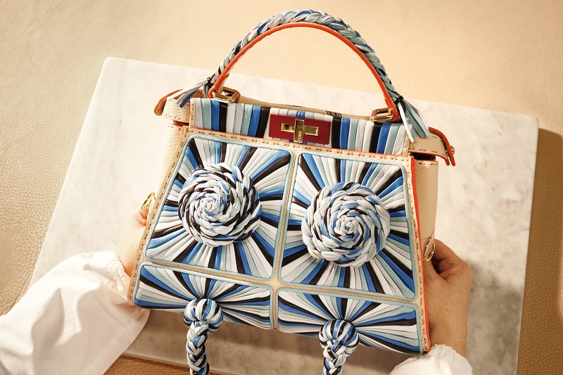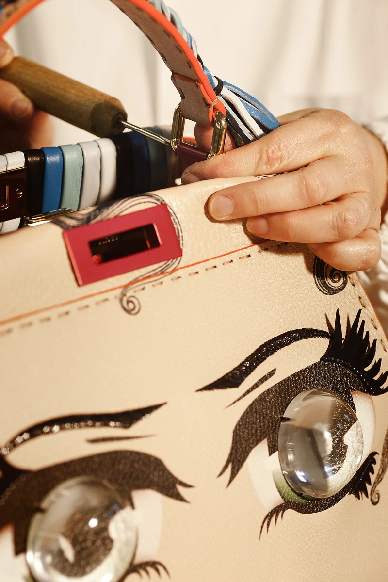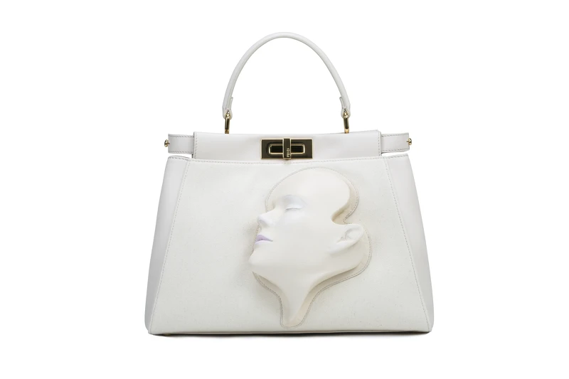 - Anna Dello Russo 為了向源源不絕提供靈感和情感給她的日本致敬,特別設計出這款 Peekaboo 手提包。她以日本漫畫為靈感,採用 Cuoio Romano Selleria 皮革製成漫畫人物的臉孔,以水晶飾在人物的眼睛、以皮革綴在睫毛和紅唇上。內襯上有著紅色大腦的插畫,背面和提把上的藍白兩刺繡代表著漫畫人物的頭髮。