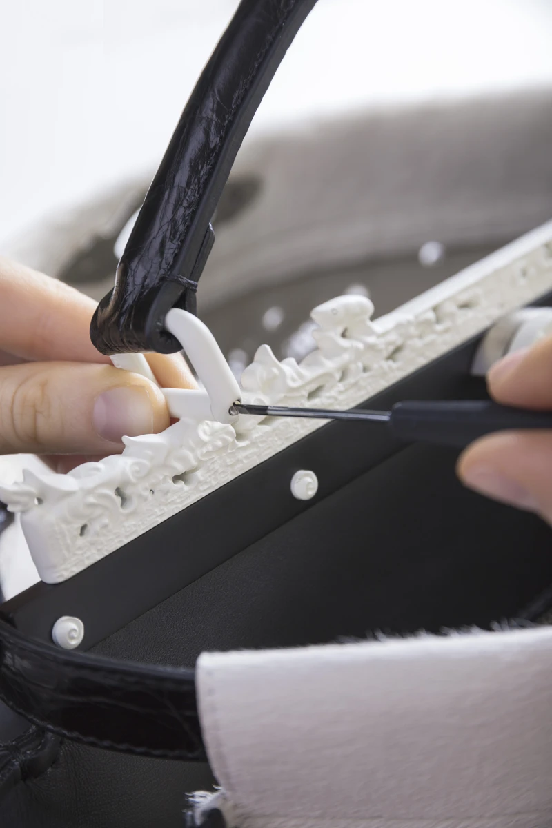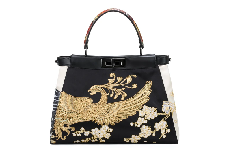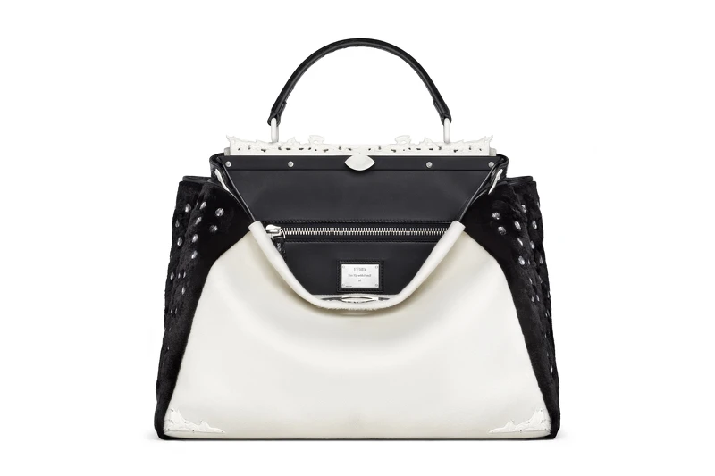 - 著名藝術家葉錦添設計出這款非常珍貴而原創的設計。這款大型 Peekaboo 手提包正面採用馬毛製作,並以水晶點綴鏤空細節。手提包內部設有一個會變色的 LED 螢幕,而手提包兩側的貂毛編織則綴有橢圓小水晶珠,手提包金屬飾條為手提包添上一份東方美,提把則以黑色皮革製成。