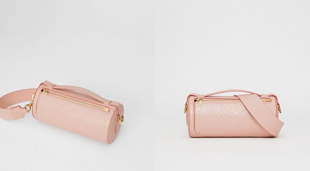 另一款同樣是Burberry的手袋,採以押字皮革設計,並打造成小型圓筒包的外觀,可以肩背或者是手提。