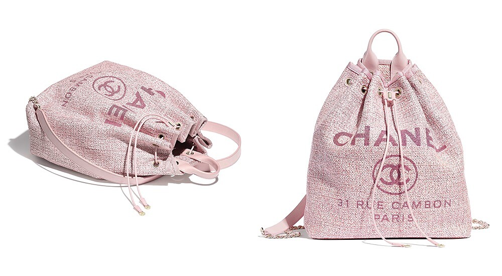 以棉、尼龍及小牛皮打造而成的粉色後背包,結合抽繩的設計看起來更年輕,除了後背功能外,也能手提上街。