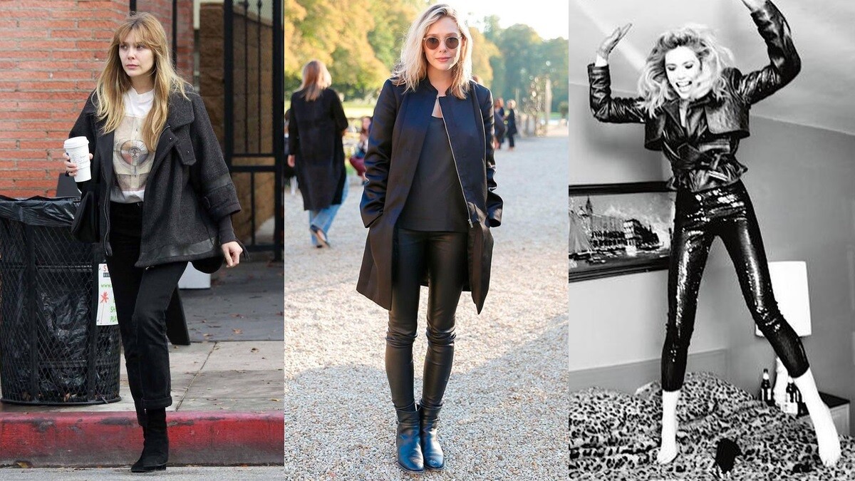 除了白色系服裝外,Elizabeth Olsen也很常穿全身黑的裝束,像是皮革套裝搭配短靴,或是長版飛行外套搭配皮革長褲等,展現較為帥氣的一面。