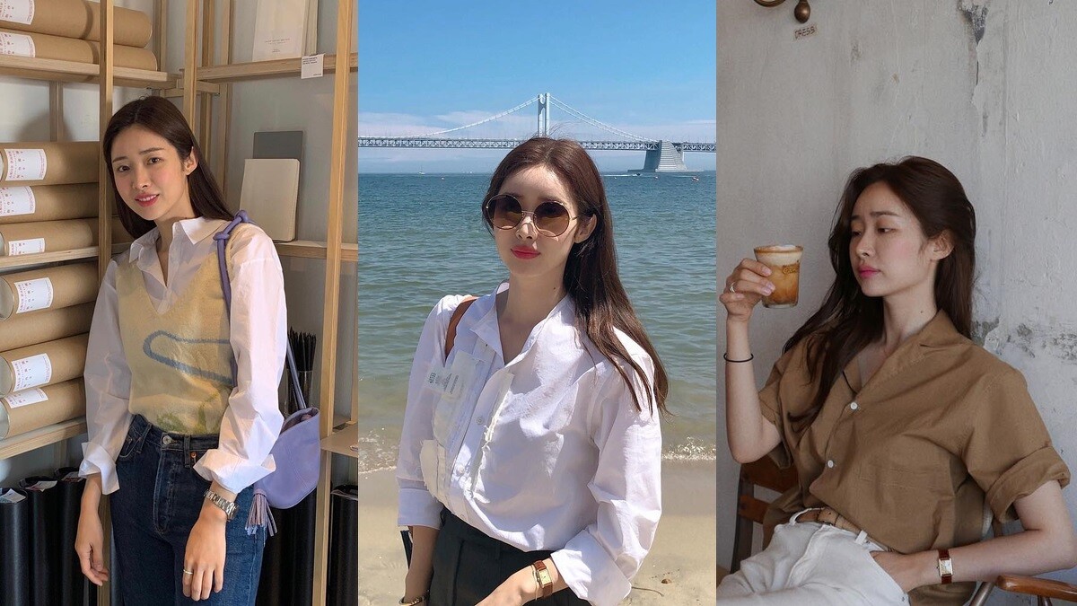 襯衫一直以來都是女孩們衣櫃中不可或缺的單品,快看車貞媛的穿搭示範,可以單穿搭配西裝褲展現俐落感,或是襯衫外面再搭上小背心看起來多一份休閒感,歐逆只靠一件襯衫就能變化出不同的風格。而今年夏天也很流行最右邊的短袖襯衫。