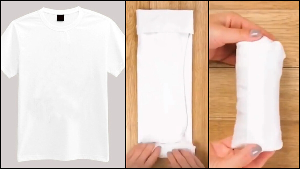 將T shirt下擺翻出一點點,再把衣服的左右兩邊往內摺,從上往下捲,再塞進剛做好的口袋裡,小巧又不會變形。