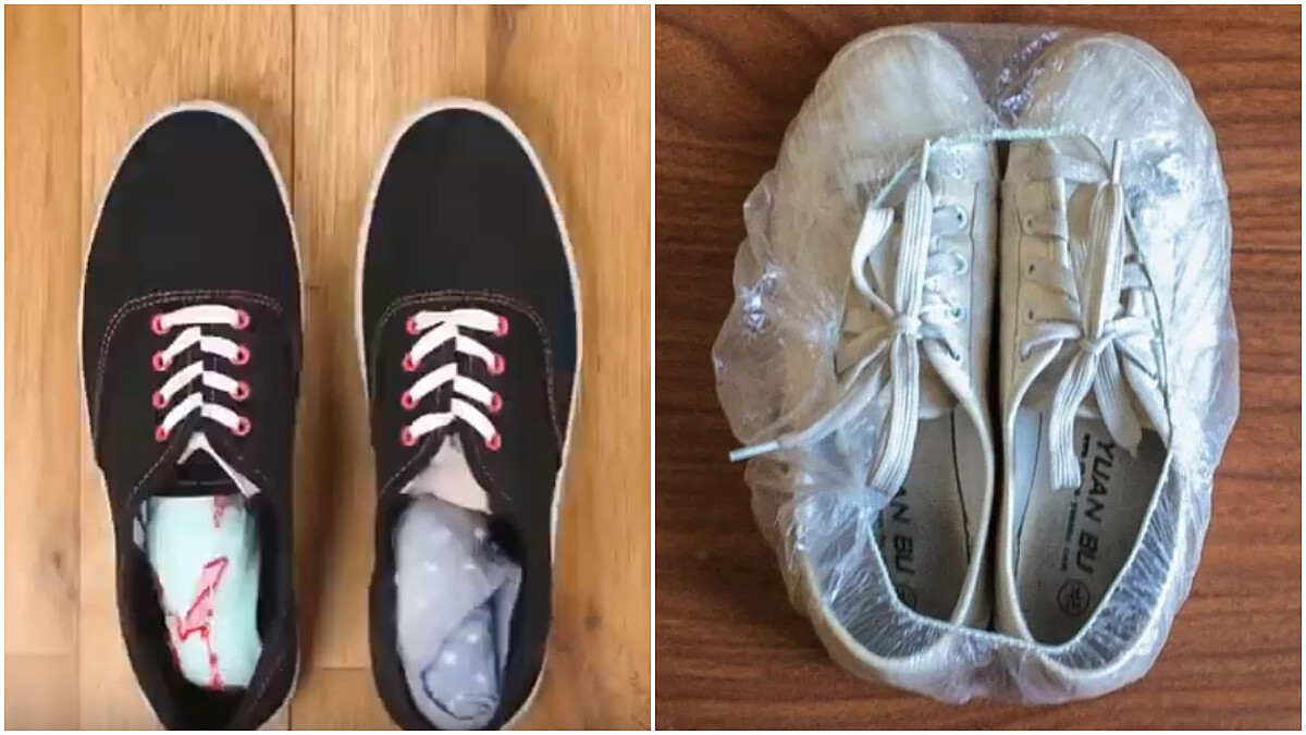 襪子交疊之後捲起,再套進開口成為一個小膠囊,將襪子塞進鞋子裡,用浴帽套住,既不會用髒行李箱,也可以利用空間收納小東西。