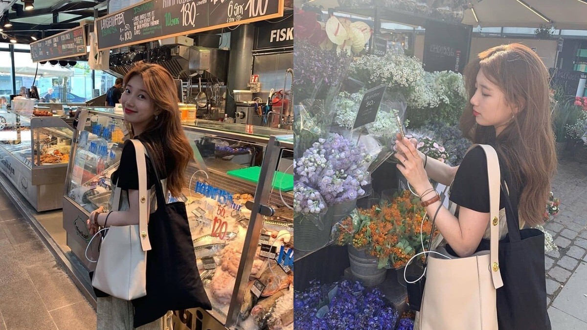 另外就是秀智出遊時揹得水桶包 Joseph Shopper系列,分成S、L兩種尺寸,外型看起來簡約俐落,包包空間可以容納手機、錢包等個人物品,不論是上班、外出攜帶都合適。手袋外頭還有品牌標誌性的小剪刀LOGO。