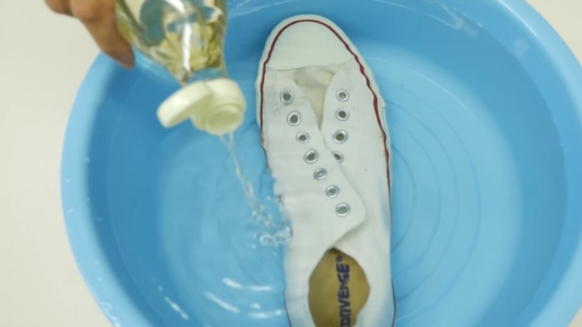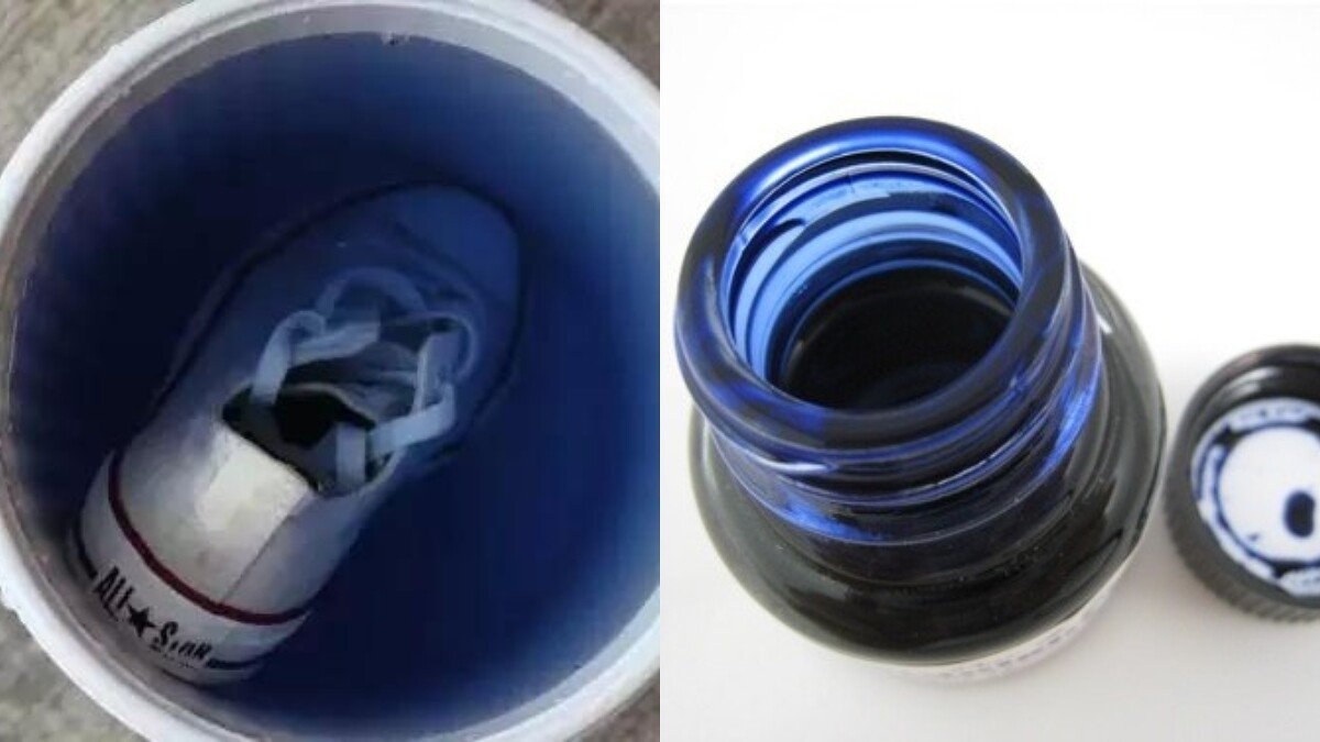 帆布小白鞋久沒穿容易泛黃,準備一桶溫水及一瓶藍墨水,記得要純藍墨水而不是藍黑墨水!將鞋子浸泡在加入5、6滴藍墨水的溫水裡,大約15分鐘之後,就會發現水變得清澈,將鞋子擰乾之後(記得戴手套),再用衛生紙將整雙鞋包起來陰乾。