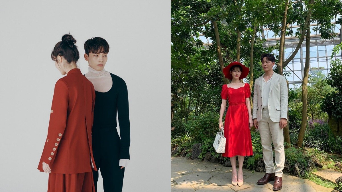 除了黑白配之外,IU也換上紅色雙排扣夾克搭配同色系裙子,站在一旁的呂珍九則穿上白色高領毛衣、深色針織上衣和黑色長褲,展現典雅又復古的穿搭風格。不曉得身為滿燦CP粉絲的大家喜歡哪一套呢!