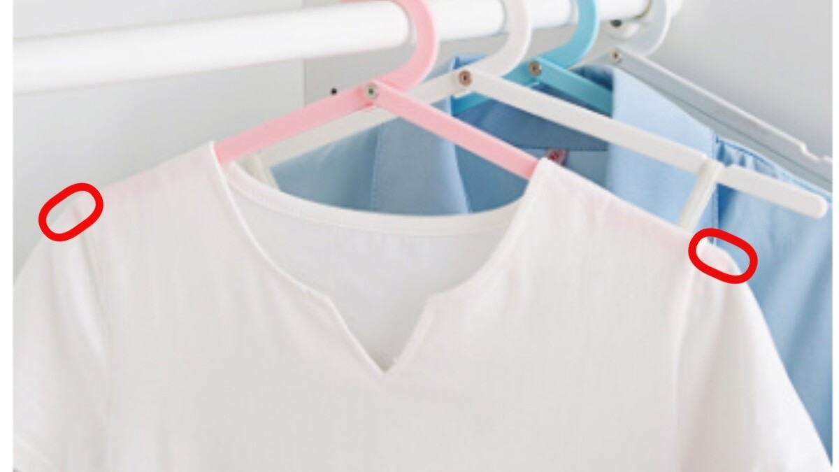 可以使用熨斗燙平,下次晾衣服時,只要記得將T shirt翻過來,裡外相反的晾起來,就可以避免衣服的肩膀處鼓起。