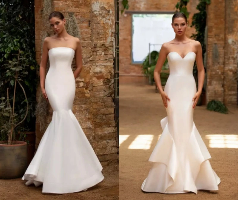 相信有不少女孩都曾幻想自己是悠遊在海洋中的人魚公主吧?那麼系列中的魚尾裙婚紗絕對會使你深深著迷!簡約的珍珠白絲緞上無任何的珠飾裝點,僅透過沙漏形+魚尾裙的剪裁突顯女性凹凸有致的身形,優雅又大器。
