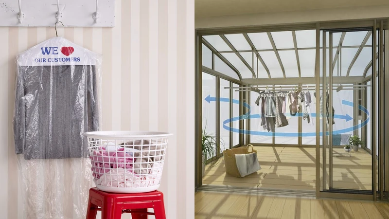 將乾洗衣物取回家後別急著穿!由於乾洗溶劑仍可能殘留表面,所以取下防塵塑膠套後,應放置通風處待油氣散去,再進行收納或穿著。