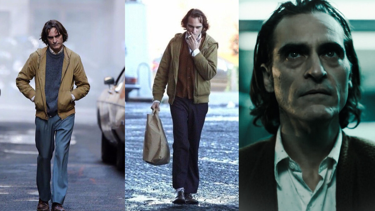 而我們也能從陳舊的襯衫、聚酯褲子、壓克力纖維毛衣等混紡原料製成的服裝,便不難知道Arthur的社經地位處於底層,價格低廉、有著重複洗滌的痕跡、風格當然也不時髦,走的是經濟實穿路線,但其實這些衣服是為了電影特別訂製的仿舊服裝。在一幕洗衣服的鏡頭中,Arthur將服裝一股腦地往洗衣機內丟,對於服裝保養毫不在意的小動作也能看出,生存下來已經很不容易了,服裝狀態當然不會是他在意的生活細節。而三十好幾的Arthur跟病母相依為命,生活圈狹小幾乎沒有朋友和社交生活,所以衣著會顯得較笨拙,棕色連帽外套和白襪,以三十幾歲的年紀而言已略顯稚氣。