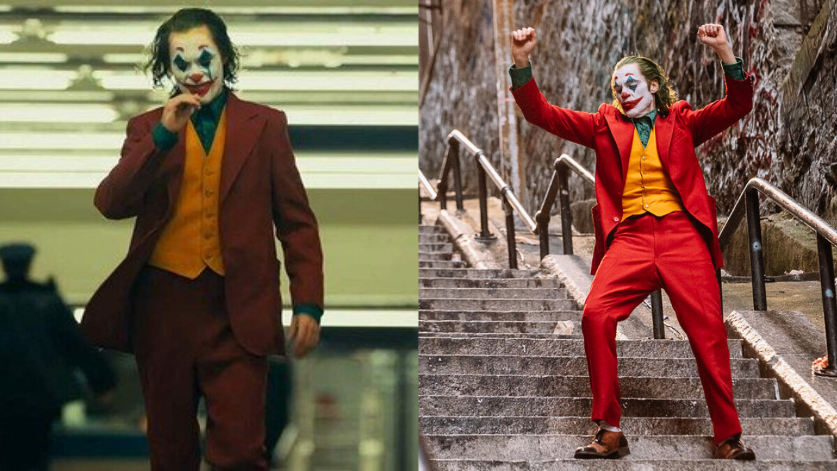 也可以注意到Arthur在轉化成小丑前,服裝多以石灰藍、棕、淡紫色等冷調色為主,一表高譚市與Arthur的人生有多絕望與陰鬱。