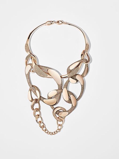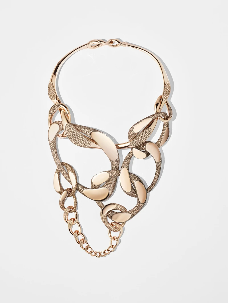 P.H.:大部分是重量和舒適度,好比 Fusion這件以緞面鈦與玫瑰金鑲褐鑽的項鍊作品,為了要達成大份量的輪廓,初期我們打算使用較輕的鈦金屬製作,但要如何將鈦金屬處理得彷彿為黃金質感,同時兼具流動感,是非常大的挑戰。