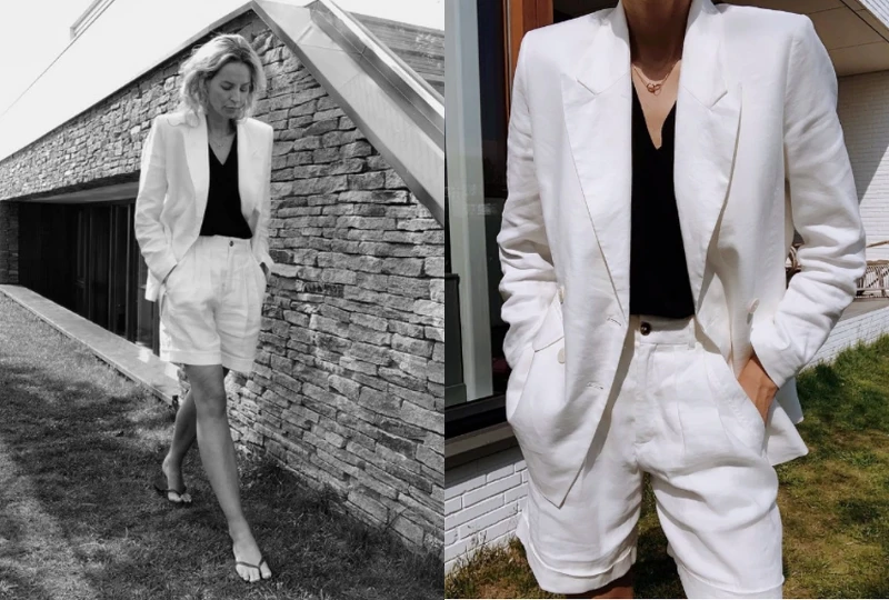 這身造型再罩上西裝外套後更顯帥氣!然而比起球鞋和高跟涼鞋的搭配,Anouk Yve反而選擇穿上休閒的夾角拖鞋,展現瀟灑不羈的個人態度。