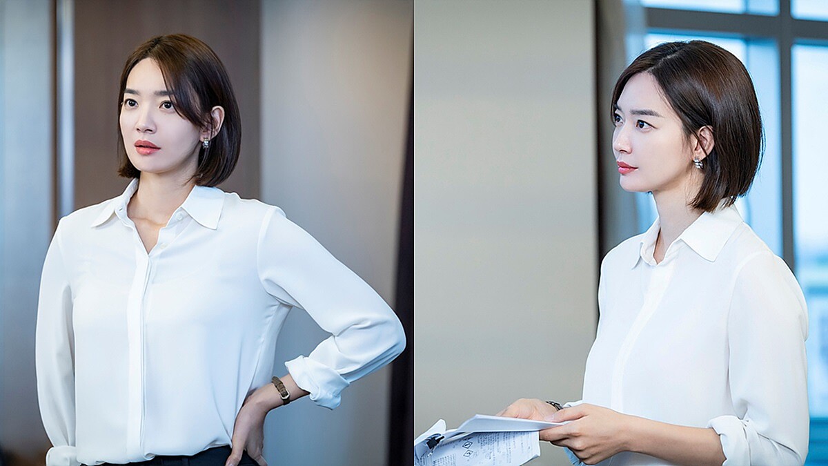 正式西裝套裝怎麼能少最經典的黑色!申敏兒以白色襯衫搭配黑色西裝外套、長褲,詮釋幹練的女強人形象。