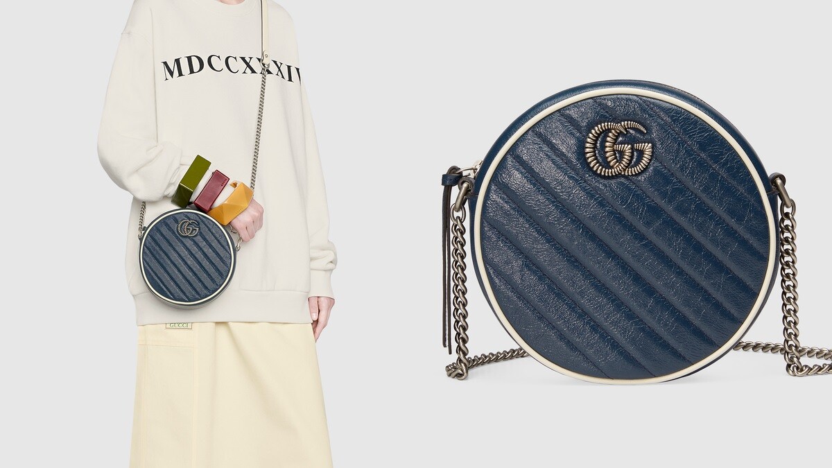 以藍色斜紋皮革搭配對比鮮明的白色包邊處理,復古的銀色雙G標誌做擰花飾帶設計,俏皮可愛的圓形包款,完美演繹早春氛圍。