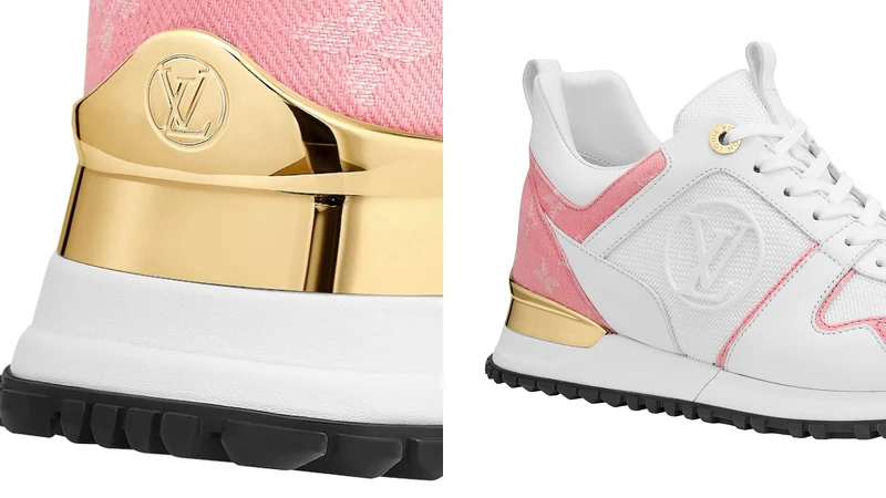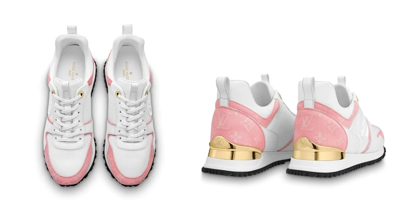 以白色小牛皮和粉紅色Monogram牛仔布重新演繹的經典鞋款RUN AWAY運動鞋,搭配技術性橡膠鞋底,同時設有內層隱形鞋墊,可以無痛增加高度。鞋款後方的金色徽章綴上LV Circle標誌,可說是吸睛度十足。