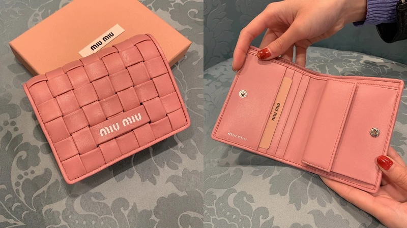 MIU MIU 粉色皮革編織短夾,NT15,000