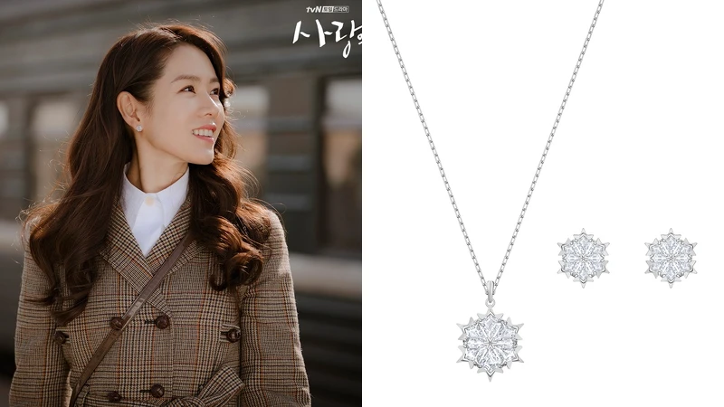 孫藝珍在《愛的迫降》第一集中,因為飛行傘意外事件,不小心被龍捲風吹到北韓,正巧碰上在值班的利正赫,有就是由玄彬飾演的男主角,相遇時配戴施華洛世奇最新聖誕系列NAUGHTY項鍊 NT3,490及同系列耳環NT2,990。黑色羽毛圖案以玫瑰金收邊的項鍊、耳環,為世理穿搭增添亮點。