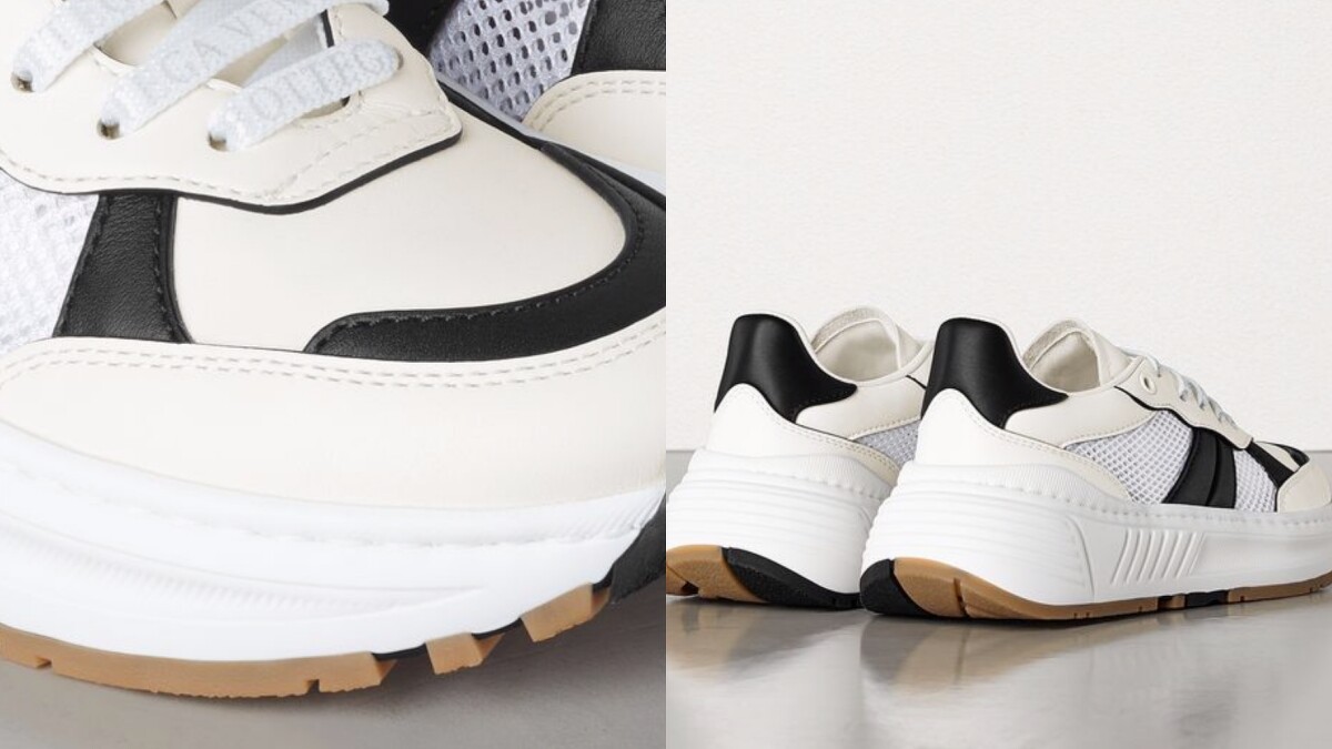 這款運動鞋在鞋面上採用雙色與黑色皮革線條點綴,並加入網眼面料,提升整體休閒風格;鞋帶採用BOTTEGA VENETA浮水印效果字樣,低調顯露奢華。