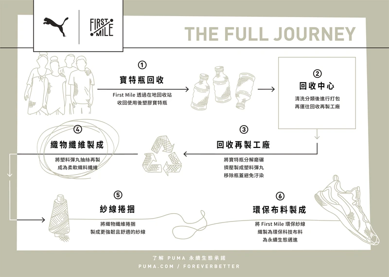 PumaXFirst Mile環保機能系列,其中形象款湖水綠風衣外套與機能緊身褲,皆分別用12個回收寶特瓶再製而成;PUMA Erupt TRL by FIRST MILE專業戶外慢跑鞋與PUMA LQDCELL Shatter by FIRST MILE的鞋面均採用2個回收寶特瓶再生紗線製成。
