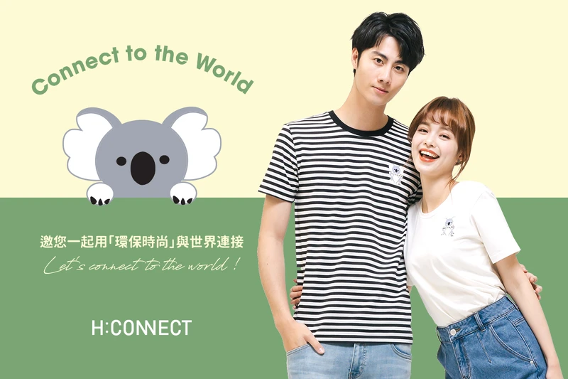 韓國快時尚品牌H:connect為響應地球日50週年,今年首度設計限量的Connect to the World系列單品,採用無添加染劑的酵素彈力棉、環保色紗添加彈性纖維、竹節棉等製作限量系列。同時,以無尾熊為設計概念,加入可愛的無尾熊圖騰,淨收入將捐贈給澳洲紅十字會,再度為先前的森林大火盡份心力。
