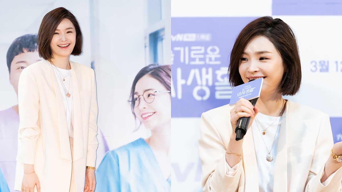 《機智醫生生活》的開播記者會上,田美都就穿著了淺色系的西裝套裝,上醫則是選擇白Tee,看起來率性又不失正式感,而她特地加上項鍊能為整體造型更加分。