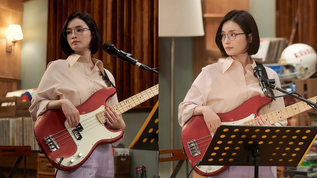 為了重現學生時代的舊時代感,蔡頌和穿上條紋針織上衣登場,搭配淺色系牛仔褲,正巧符合當今的復古風潮。
