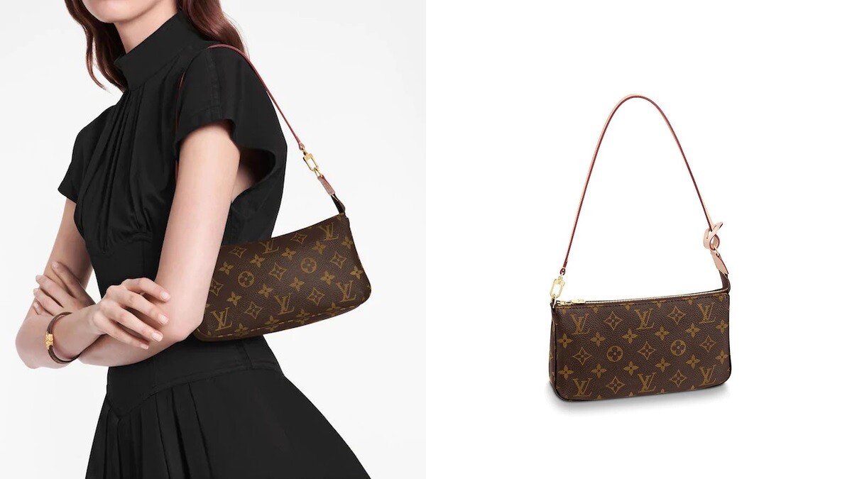 精品之王路易威登也有一款外觀扁身的腋下包「Monogram小型肩背包」,採用標誌性的LV Monogram 帆布製作,搭配方便開合的拉鍊設計,可以容納錢包、手機、隨身小物…等等,除了較短的肩背帶,也能自由選購長背帶更換,滿足不同穿搭的需求。