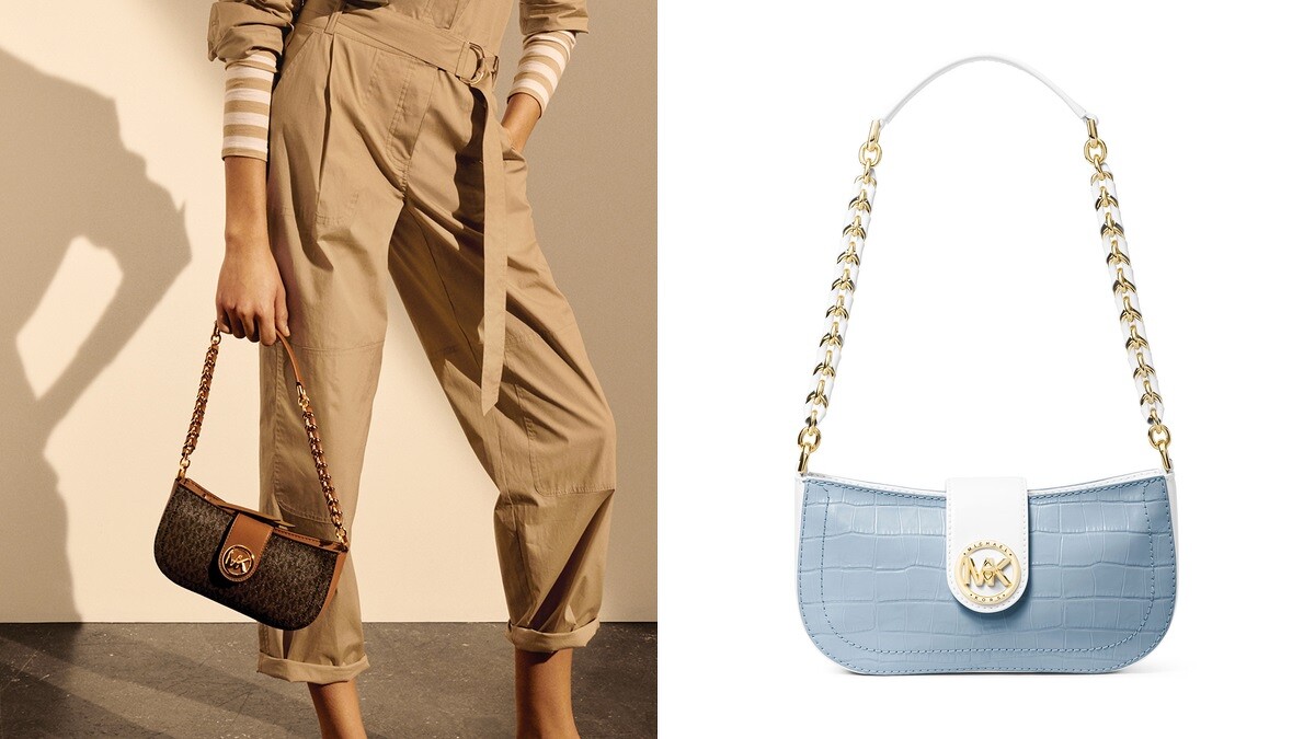 從日常生活及旅行印記中擷取靈感,打造2020春夏全新Carmen系列,這之中最新推出的「Carmen肩背包」,就是當今最流行的腋下包款代表,採用來自義大利的頂級Saffiano皮革及鱷魚紋皮革製作,加入品牌標誌性的MK Logo防水帆布材質,搭配精緻編織鍊帶與搶眼金屬Logo,重點是小巧可愛的包款剪裁,可以滿足女孩日常、晚宴、旅行等不同穿搭裝扮。
